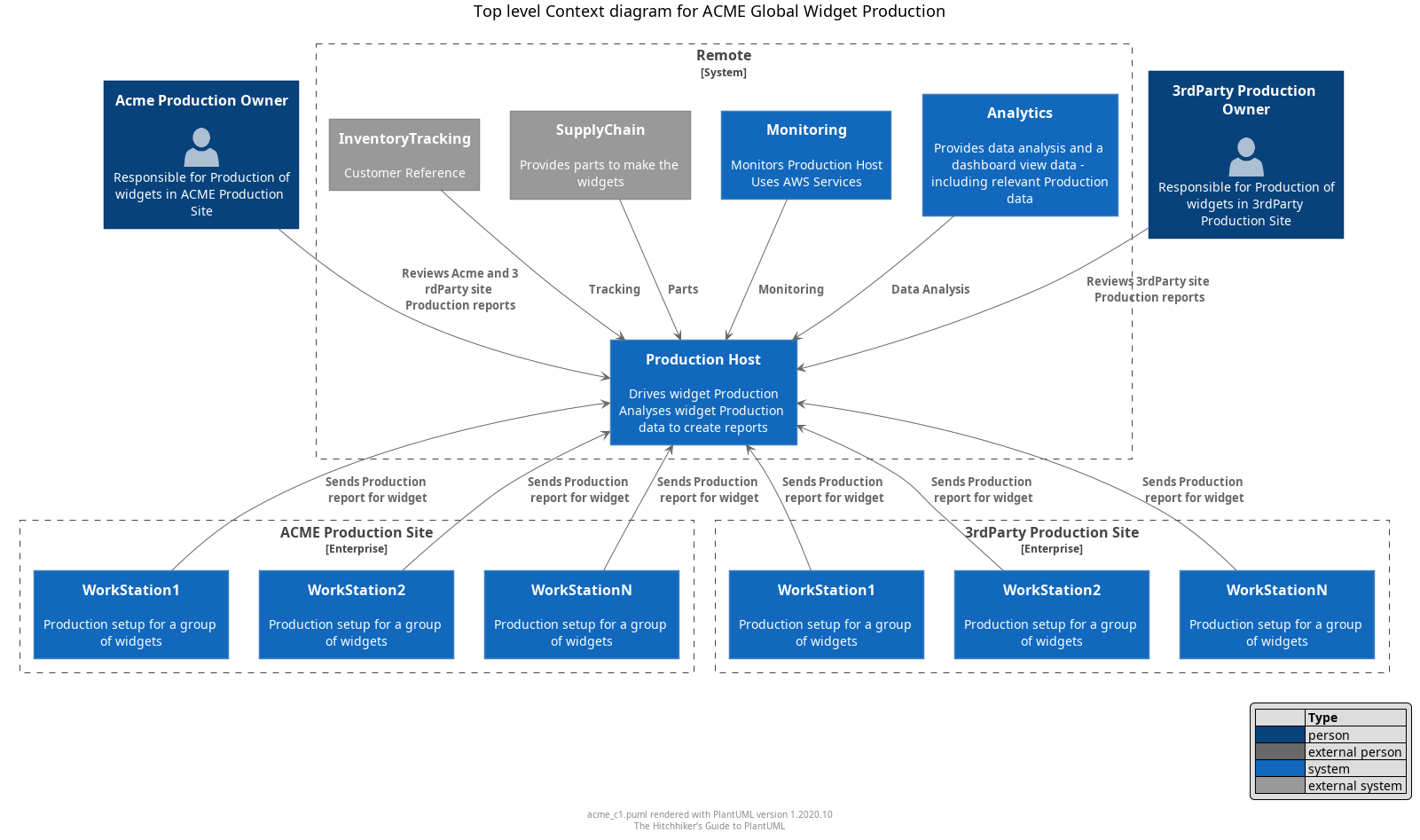 Rel_U(AcmeWorkStation2, ProdSystemHost, "Sends Production report for widget")
